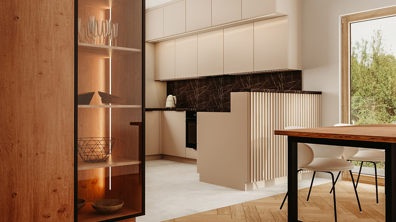 Nowoczesna kuchnia z podniesionym półwyspem. Od strony kuchni – ukryte szafki i pełna funkcjonalność, od strony jadalni – eleganckie wykończenie i subtelne wydzielenie strefy.