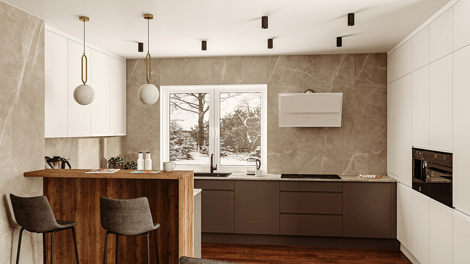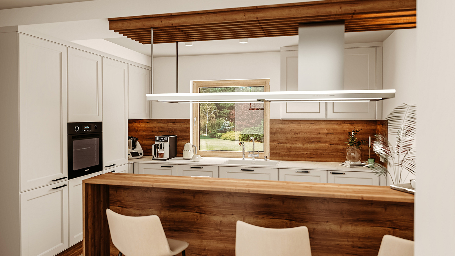 Nowoczesna kuchnia z półwyspem, drewnianymi wykończeniami i efektownym okapem wyspowym wkomponowanym w lamele.