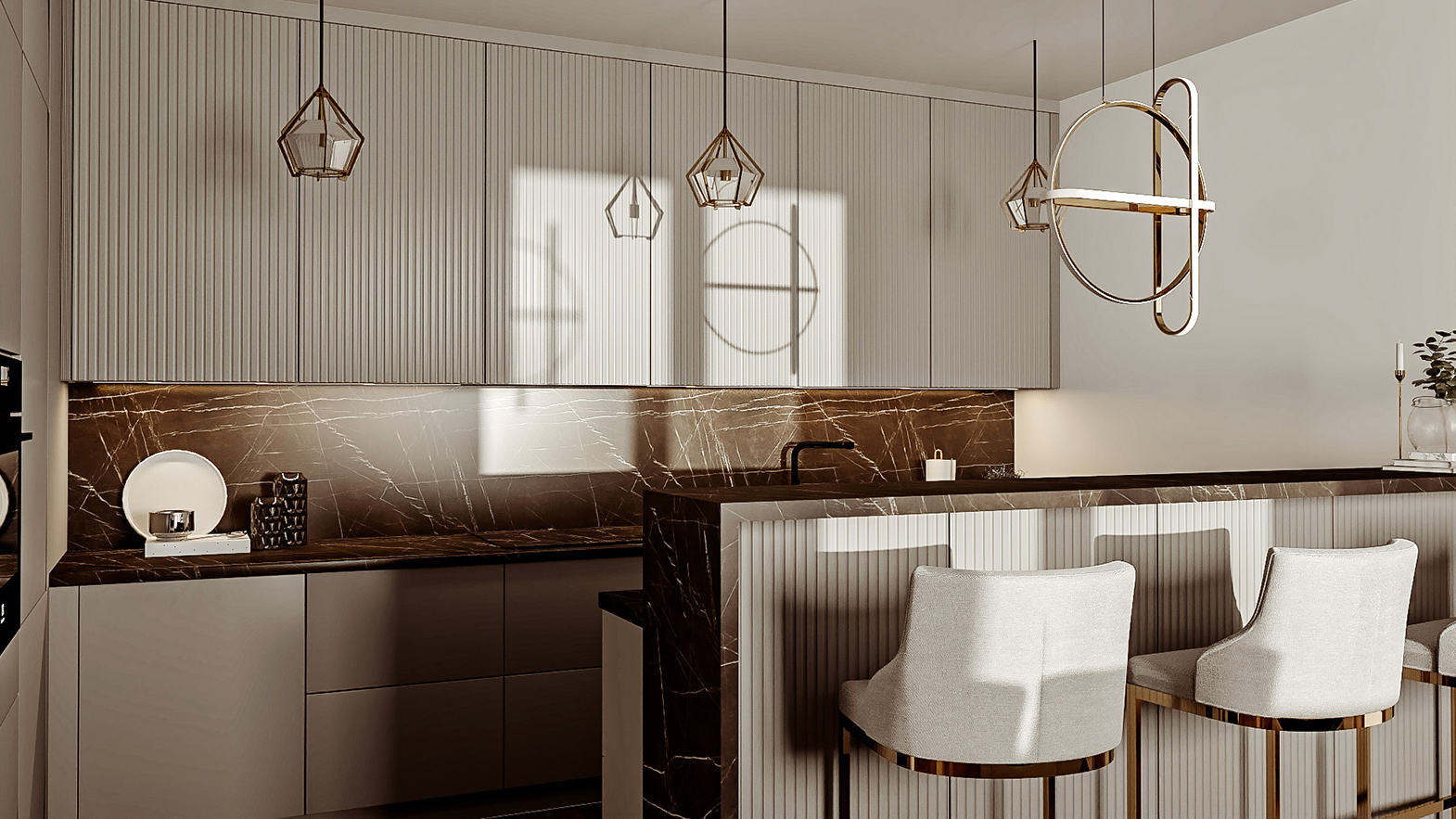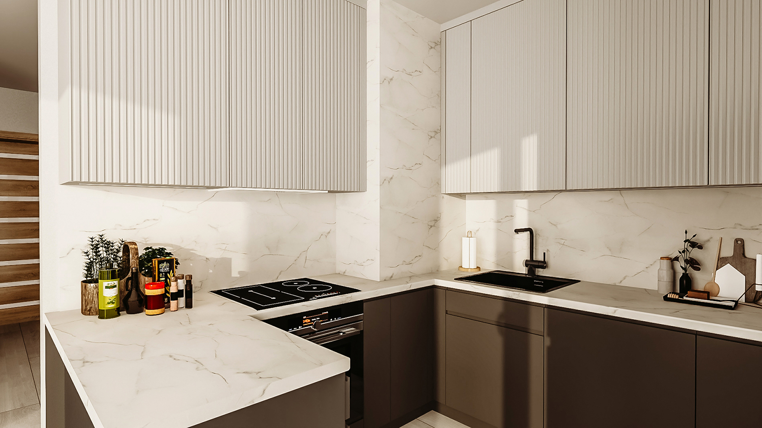 Nowoczesna kuchnia z półwyspem odchodzącym od ściany i ryflowanymi frontami.