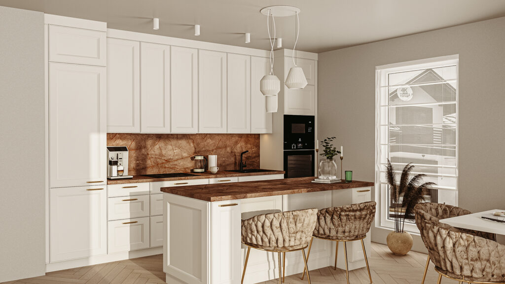 Proces projektowy to znacznie więcej niż narysowanie szafek. To cały ciąg decyzji: od rozpoznania potrzeb, przez stworzenie układu funkcjonalnego, dobór materiałów i systemów, po detal, jak uchwyt czy rodzaj zawiasów. Dobry projektant łączy estetykę z techniką, a swoją wiedzą i doświadczeniem przeprowadza klienta przez cały proces. Na zakończenie przygotowuje fotorealistyczną wizualizację 3D, która pozwala zobaczyć projekt w bardzo zbliżonej formie do efektu końcowego – z oświetleniem, teksturami i kolorami, które odpowiadają rzeczywistości. To etap, który daje klientowi pewność, że wszystkie decyzje były trafne.