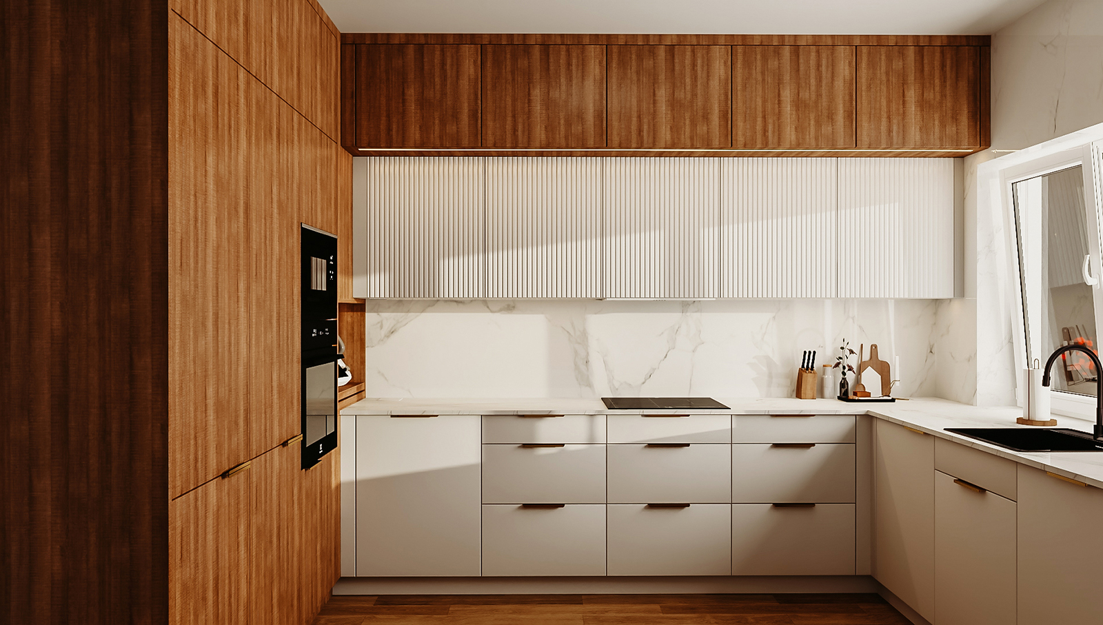 Nowoczesna kuchnia to taka, w której funkcjonalność idzie w parze z designem. Dlatego stosuję innowacyjne systemy przechowywania i ciche mechanizmy otwierania, które zwiększają komfort użytkowania. W zależności od potrzeb mogę zaprojektować kuchnię z:
