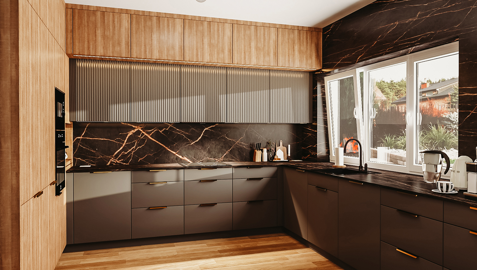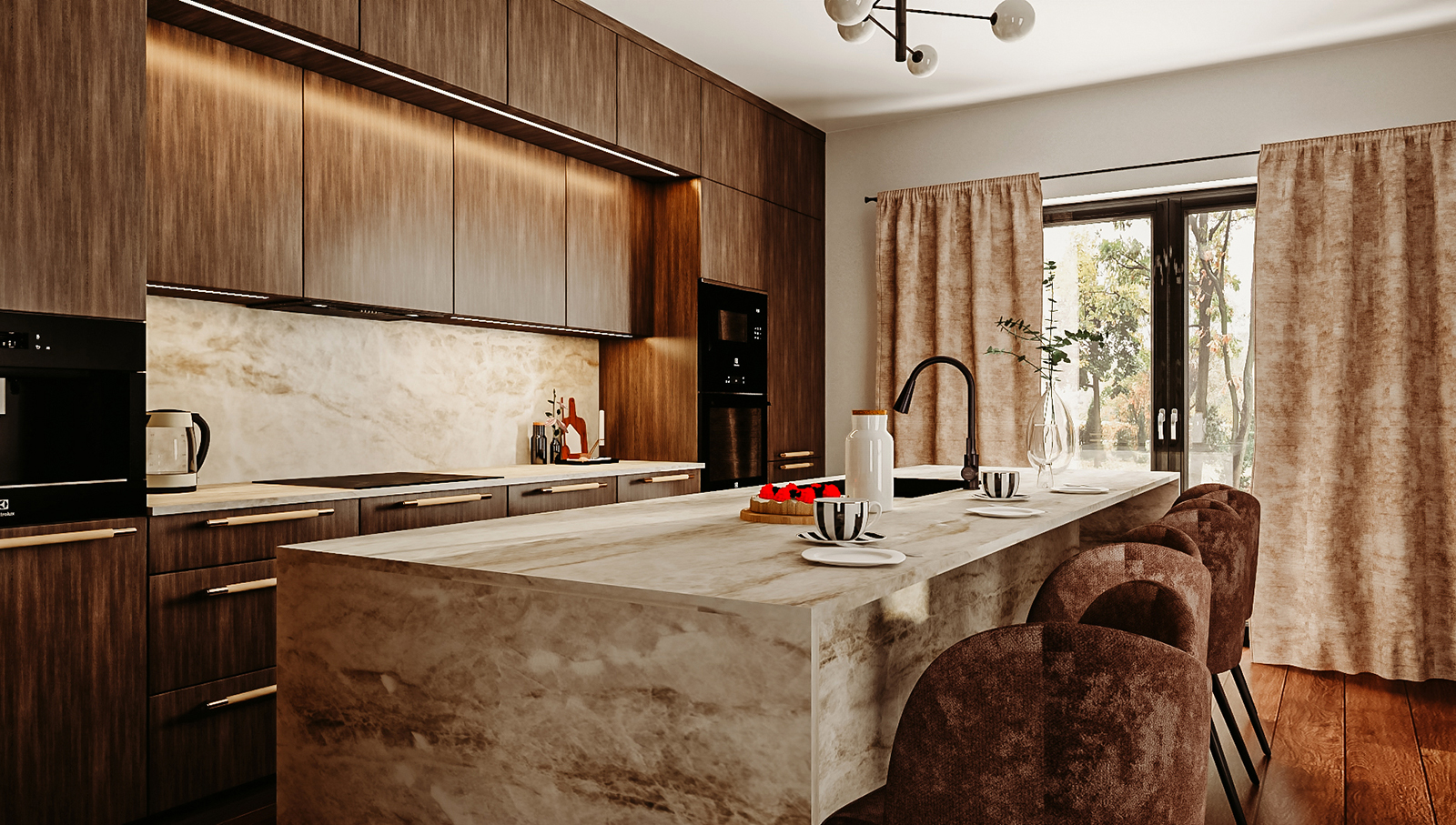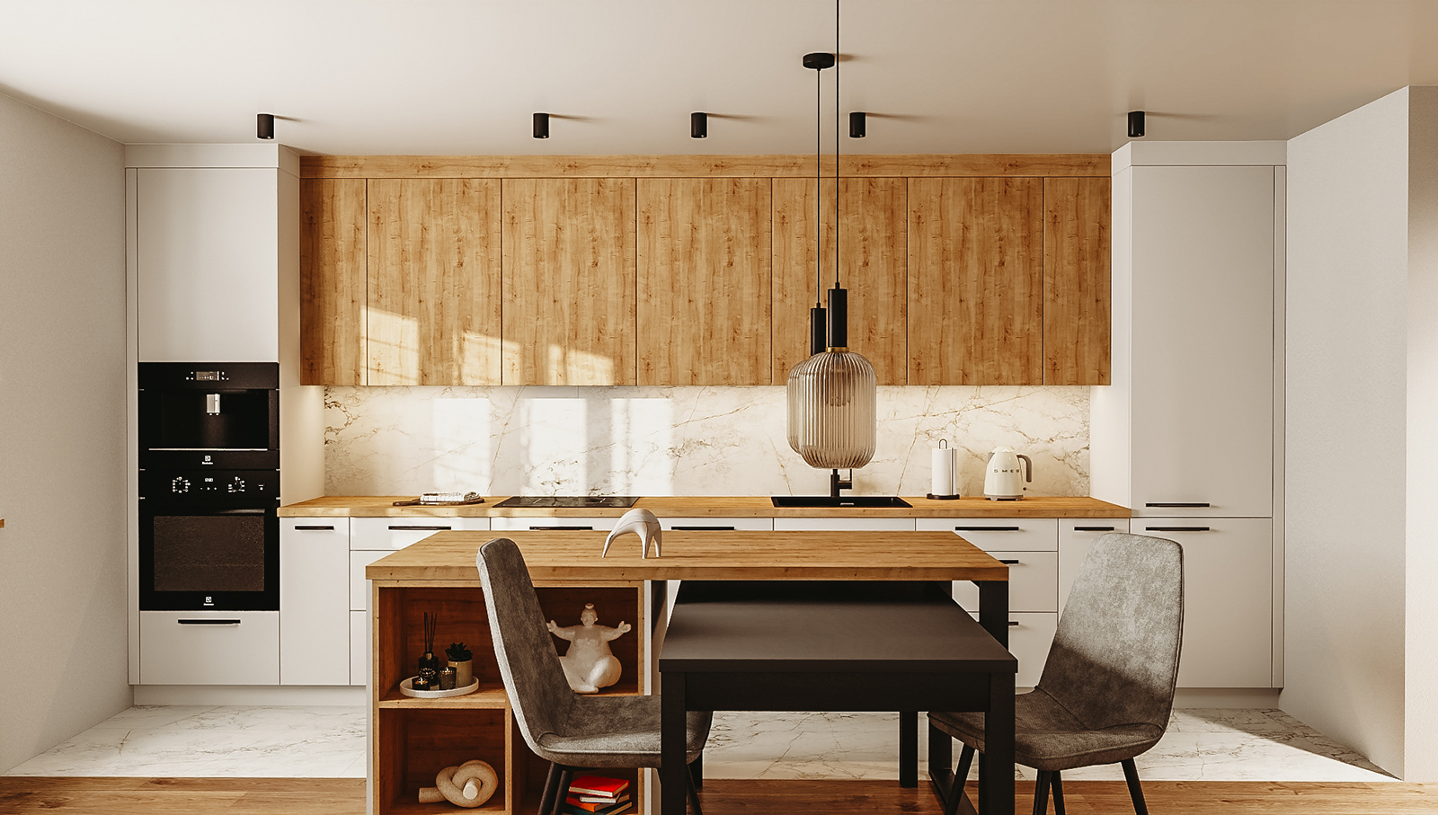 Kiedy znam Twoje potrzeby, przygotowuję projekt i fotorealistyczną wizualizację 3D. To moment, w którym kuchnia zaczyna nabierać realnego kształtu. Widzisz układ, proporcje, kolorystykę i sposób działania poszczególnych stref. Dzięki temu łatwiej ocenisz, czy przestrzeń odpowiada temu, czego oczekujesz.